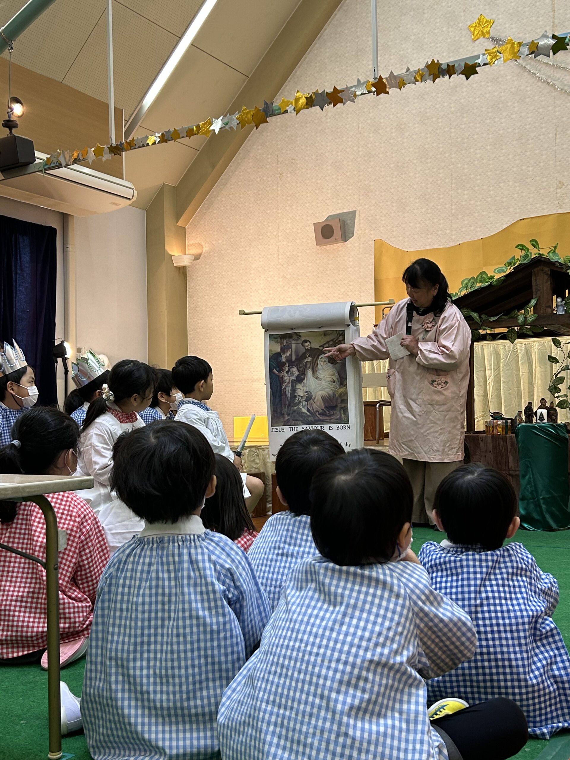 園長先生から、それぞれが言うセリフの意味やイエス様が生まれるまでのお話を聞くことが出来ました。